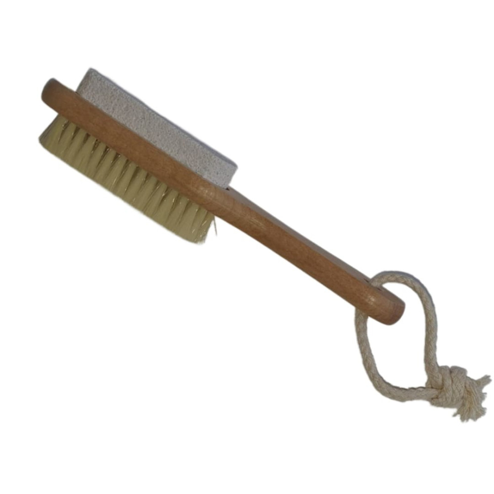 Masážní kartáč je kombinovaný s štětinami a s přírodní pemzou s rukojetí.