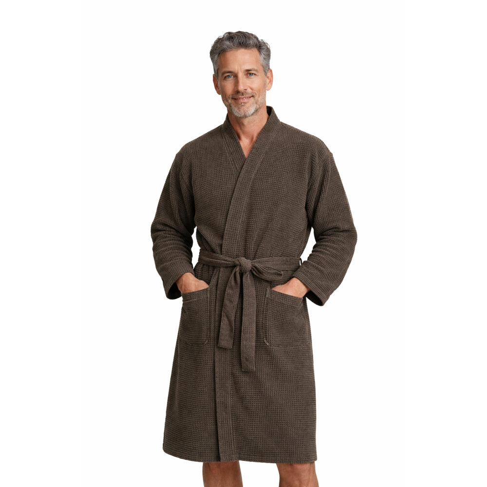 Rento skalní župan s hranami Chambray a pásem. Recyklovaná bavlna Kenno se vyznačuje jemností a živou texturou tkaniny.