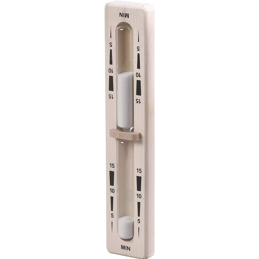 Jednoduché a tvarované přesýpací hodiny do sauny Eliga. Umožňují měřit čas až do 15 minut a jsou o rozměrech 6x32x3,5 cm. V sauně se musí umístit na jinou stěnu než jsou zavěšena saunová kamna ve výšce do 1,2m. Tolerance +/- 2 minuty.