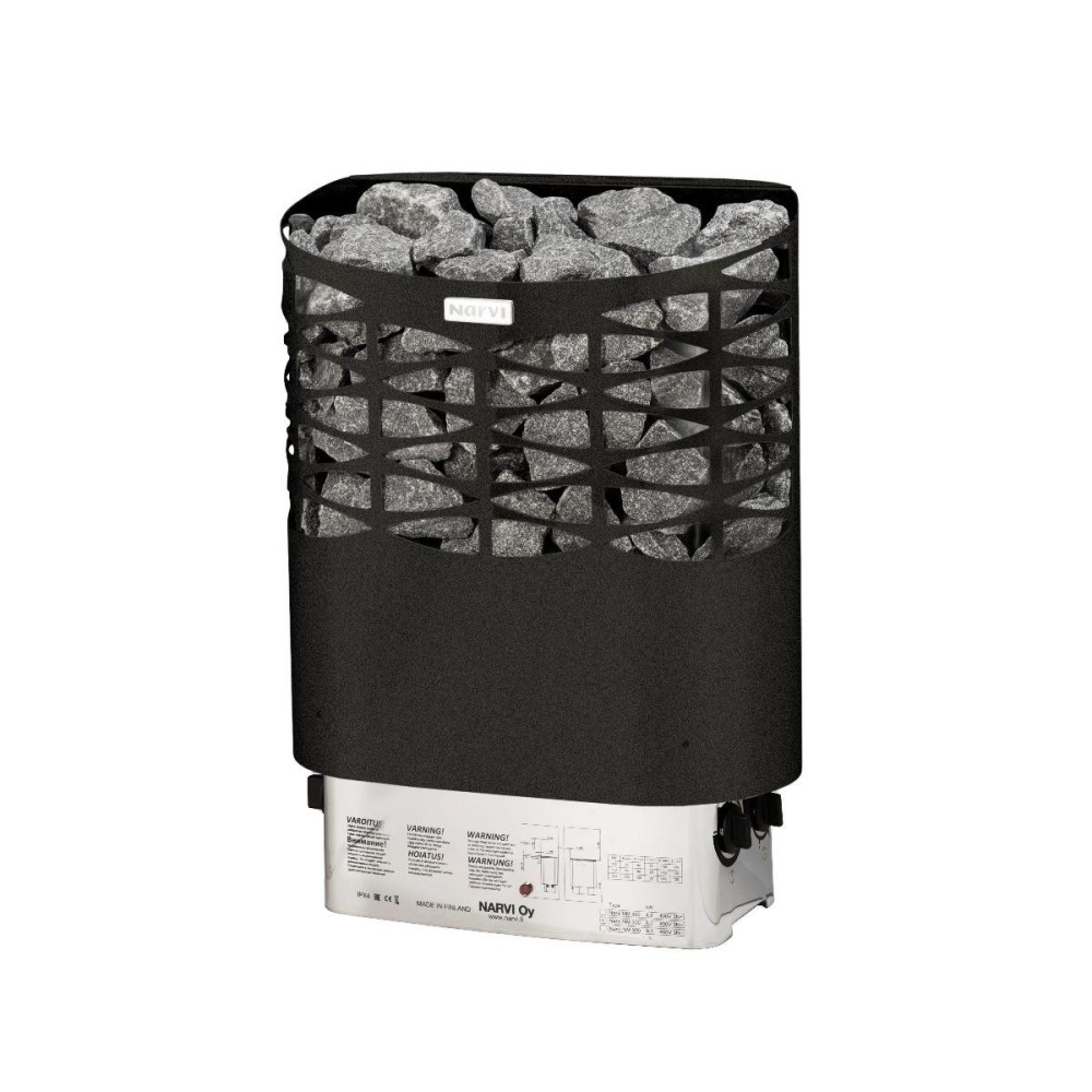 Saunová kamna v provedení Black pro umístění na stěnu a regulací na plášti od nejkvalitnější firmy na finském trhu Narvi, navržena pro snadné použití a dlouhou životnost, kvalitní ocel, větší prostor pro saunové kameny a silnější průměr spirál. Výkon 6 kW. Pro saunové kameny 5 - 10 cm, celkem 35 kg.