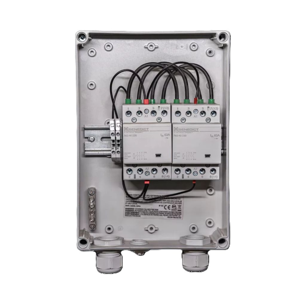 HUUM UKU Extension box rozšiřuje možnosti Vaší saunové regulace UKU, podporuje topidla nad 18 kW a zajišťuje bezpečný a spolehlivý výkon pro větší sestavy.