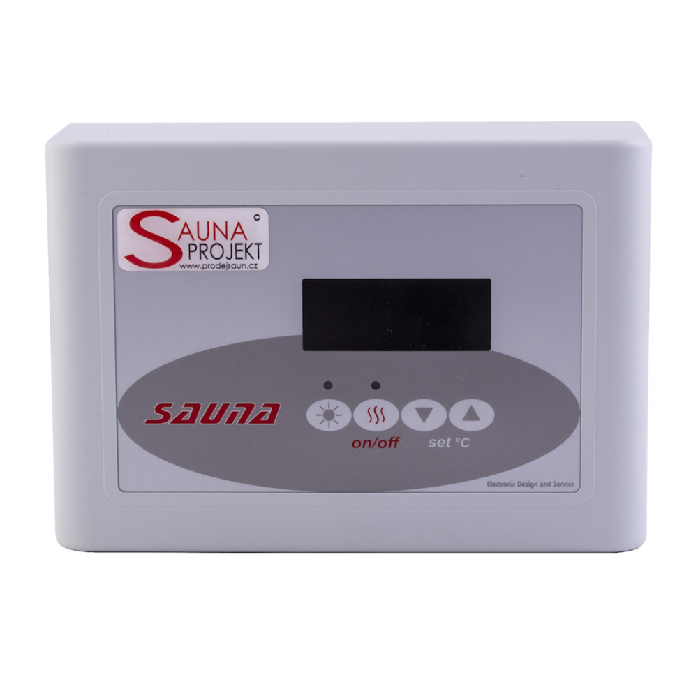 Vysoce kvalitní ovladač do sauny, který ovládá světlo a teplotu v sauně a disponuje třemi okruhy ochrany. Ovladač je umístěn mimo potní místnost.