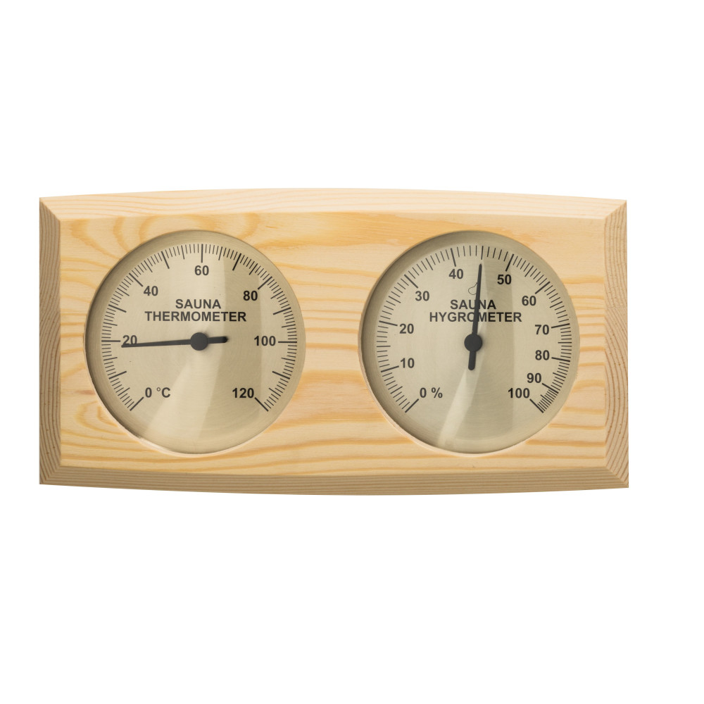 Teploměr s vlhkoměrem do sauny z borovicového dřeva a dobře čitelnými číselníky.