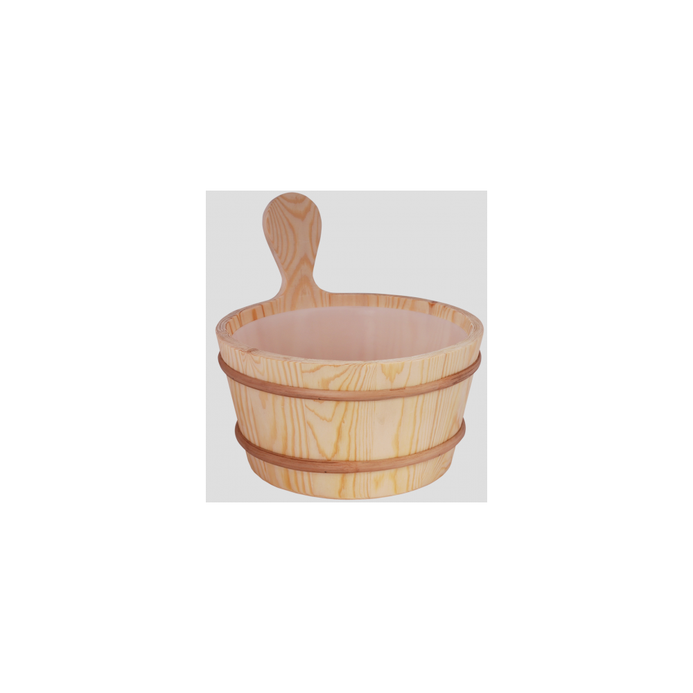 Vědro do sauny 4l. Plastová vložka chrání vnitřní část dřevěného vědra před poškozením vodou. Z vědra se nabírá dřevěnou naběračkou voda na polévání rozpálených saunových kamenů. Naběračku lze dokoupit.
