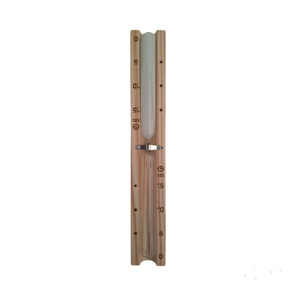 - Přesýpací hodiny s bílým pískem ze smrkového dřeva (15 min.): Umožňují vám snadno sledovat čas strávený v sauně. S jejich pomocí si můžete naplánovat ideální délku saunování bez obav o čas.