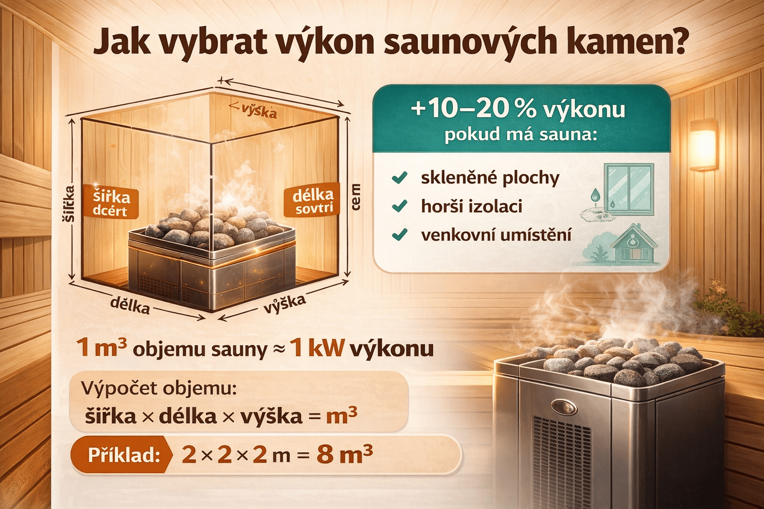 Orientačne platí približne 1 kW výkonu na 1 m³ objemu sauny.