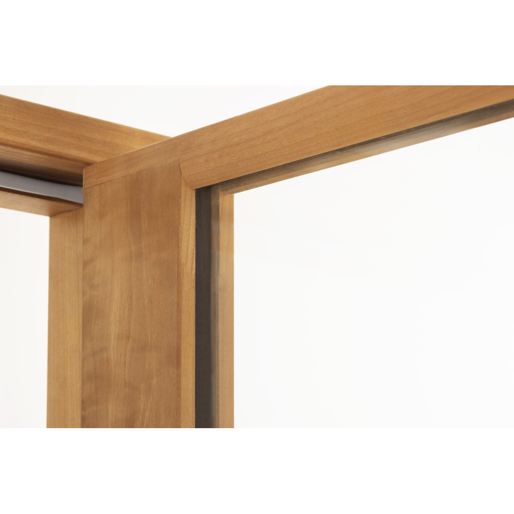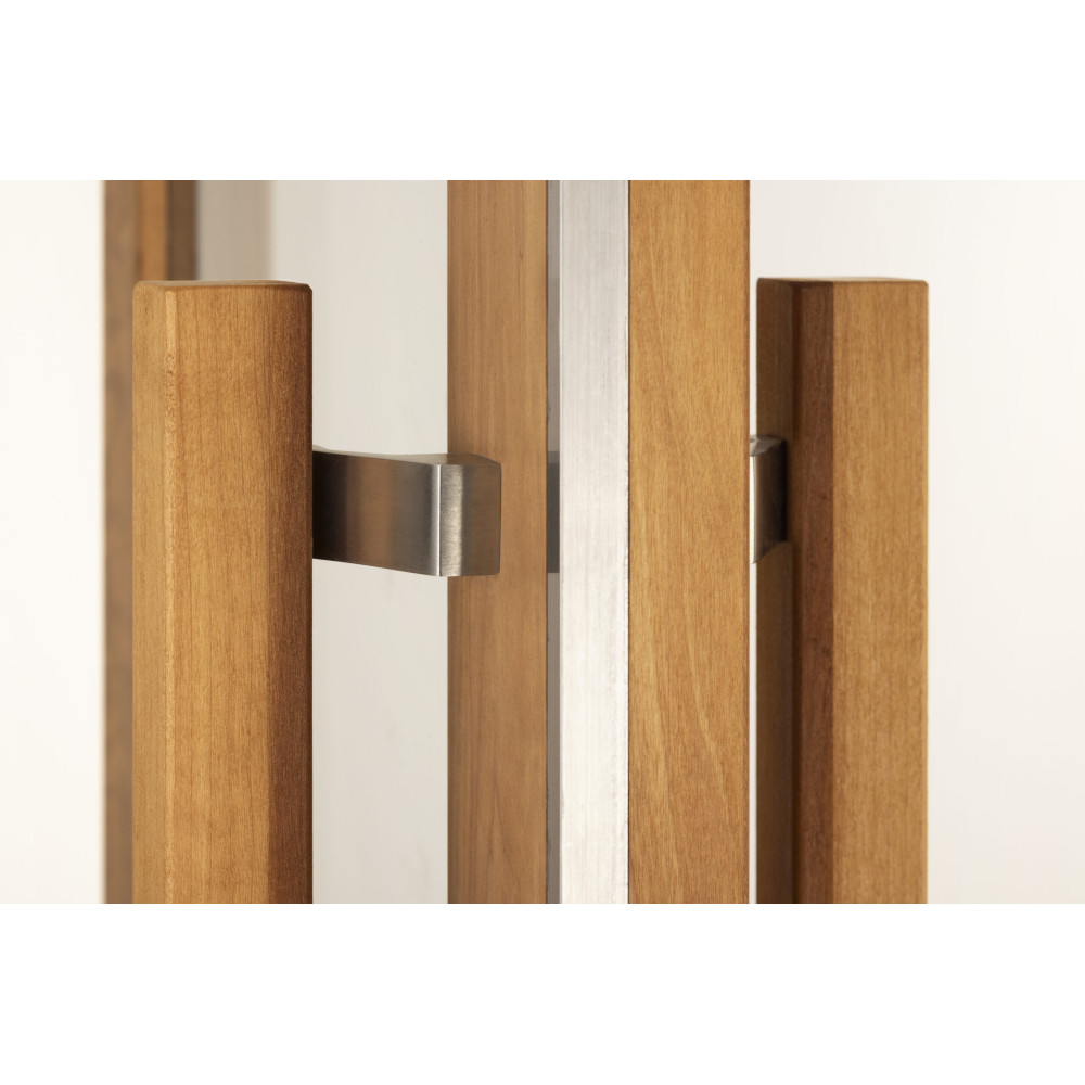 Dvere sú vyrobené z tvrdeného paketového skla a prstovo spájaných bezsukových rámov ukrytých v hĺbke 92 mm, rám Thermo osika, sklo matted číre Dvere majú elegantný magnetický zámok, skryté pánty a štvorcovú kľučku. Výrobok má univerzálnu praktickosť a je dodávaný komplexným spôsobom.