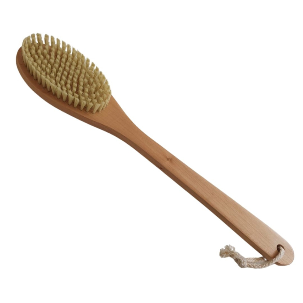 Masážne kefy navodzujú nielen fyzickú, ale aj psychickú pohodu počas každodennej telovej starostlivosti. Kefa je vyrobená pre starostlivosť o vlasy aj telo ako doma, tak v kúpeľoch a saunách. Tieto masážne a relaxačné pomôcky stimulujú obnovu buniek, podporujú prekrvenie pokožky, ktorú zároveň čistia. 100% prírodný produkt. Vďaka dlhej rukoväti je vhodný na umývanie zadných partií tela.