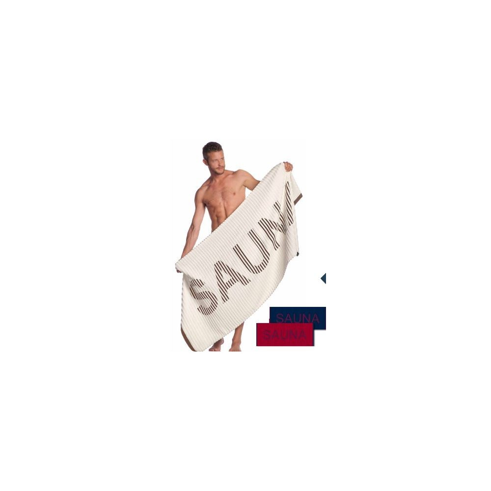Osuška do sauny - Vossen s vytkávaným nápisom "Sauna" a plastickým vzorom.