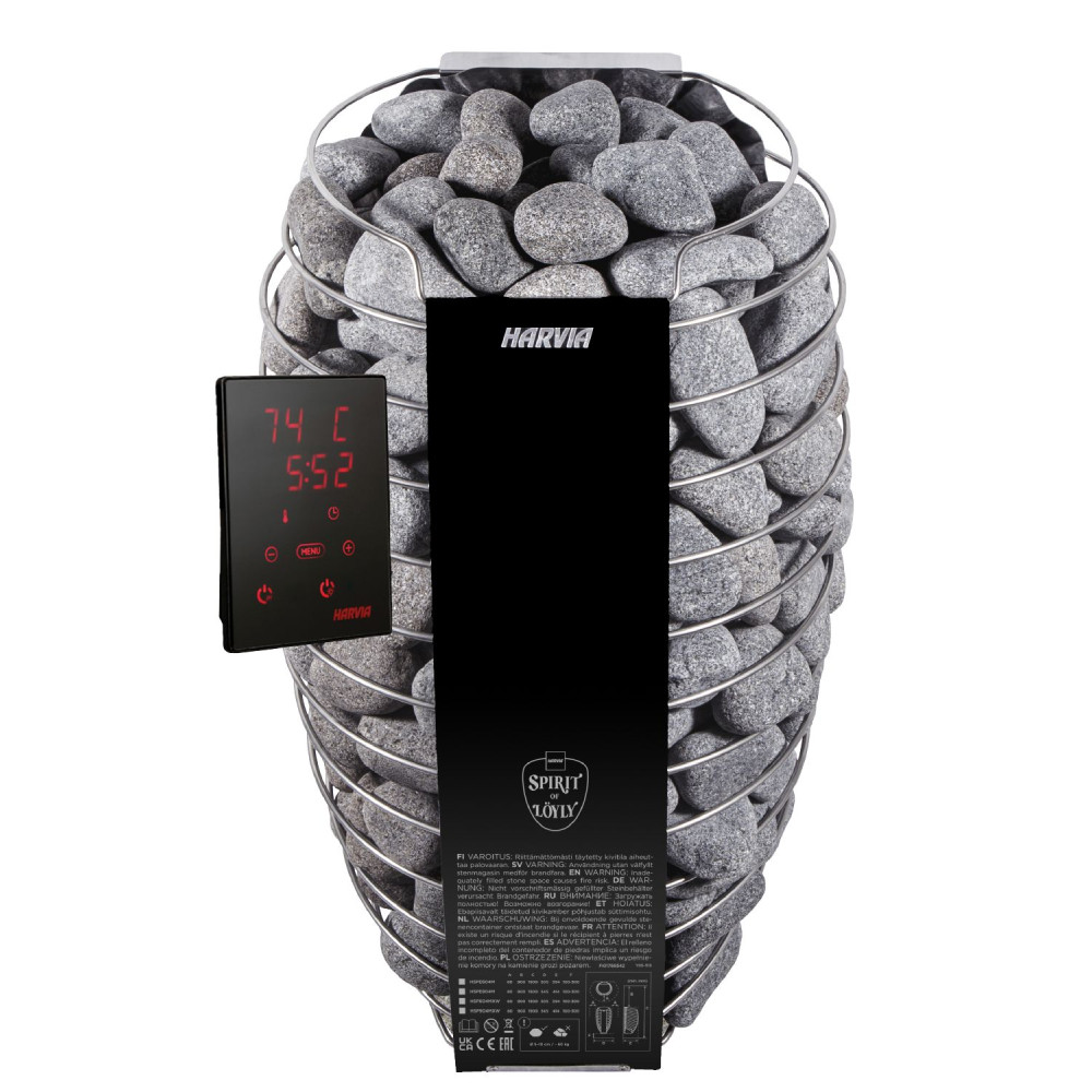 Dizajn saunových kachlí zvýrazňuje okrúhle kamene a vytvára modernú a elegantnú atmosféru. Ohrievače Spirit sú vďaka svojim možnostiam ovládania vhodné pre rôzne potreby použitia. Ohrievače sú kompatibilné s WiFi, čo vám umožňuje ovládať rôzne funkcie vašej sauny prostredníctvom mobilnej aplikácie MyHarvia.