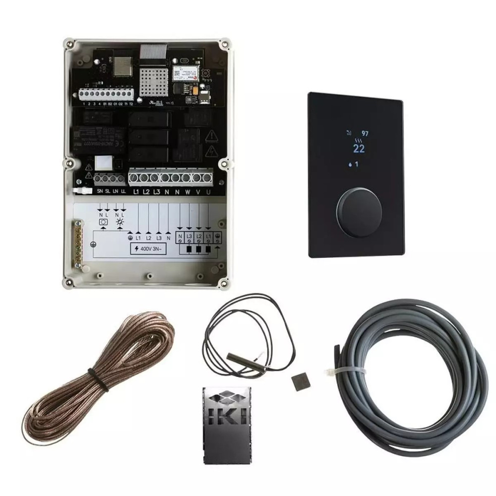 Moderný saunový regulátor s Wi-Fi, skleneným dotykovým panelom a diaľkovým ovládaním cez aplikáciu HUUM.