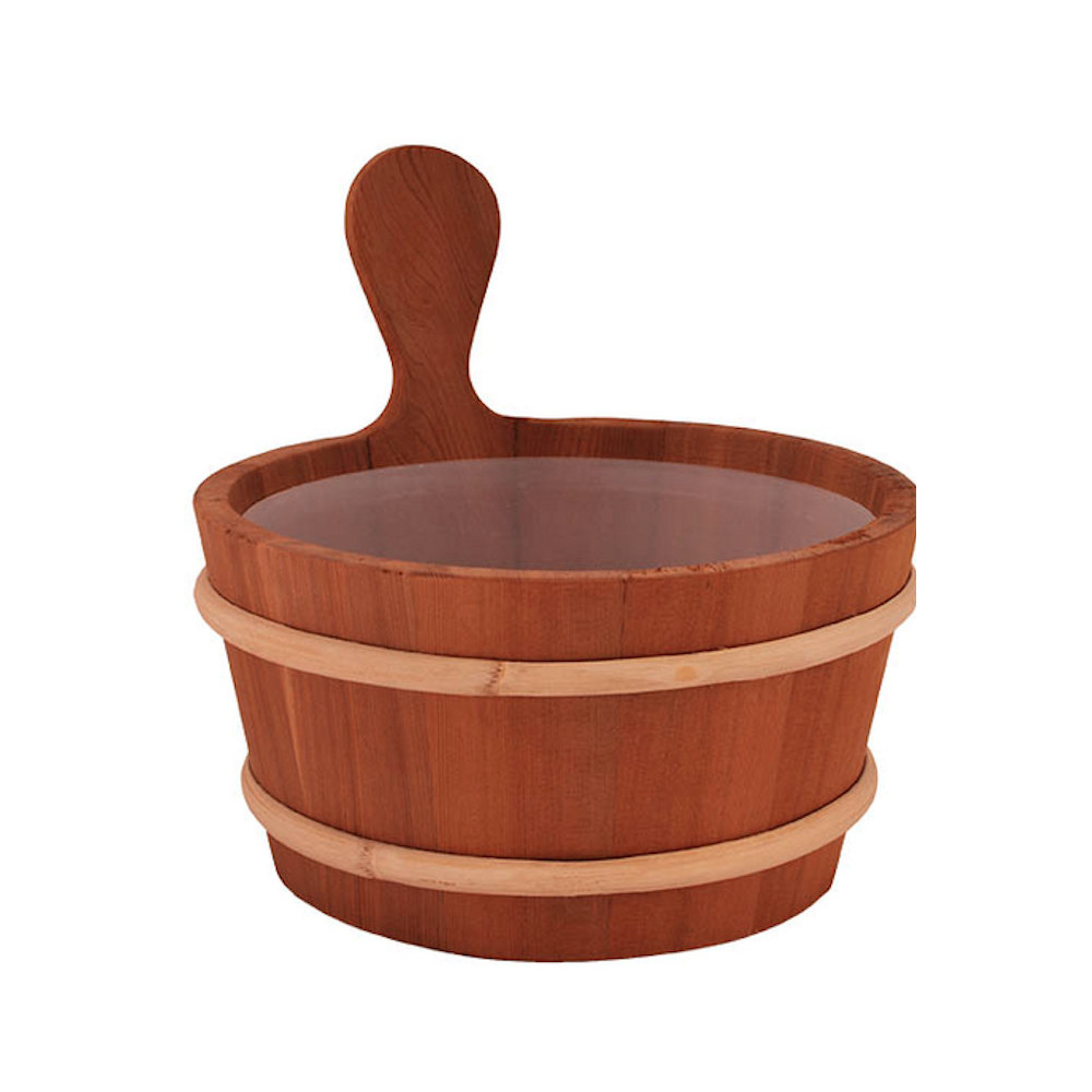 Cédrové vedro do sauny od kvalitnej značky Sentiotec 4,5L. Plastová vložka chráni vnútornú časť dreveného vedra pred poškodením vodou. Z vedra sa naberá drevenou naberačkou voda na polievanie rozpálených saunových kameňov.